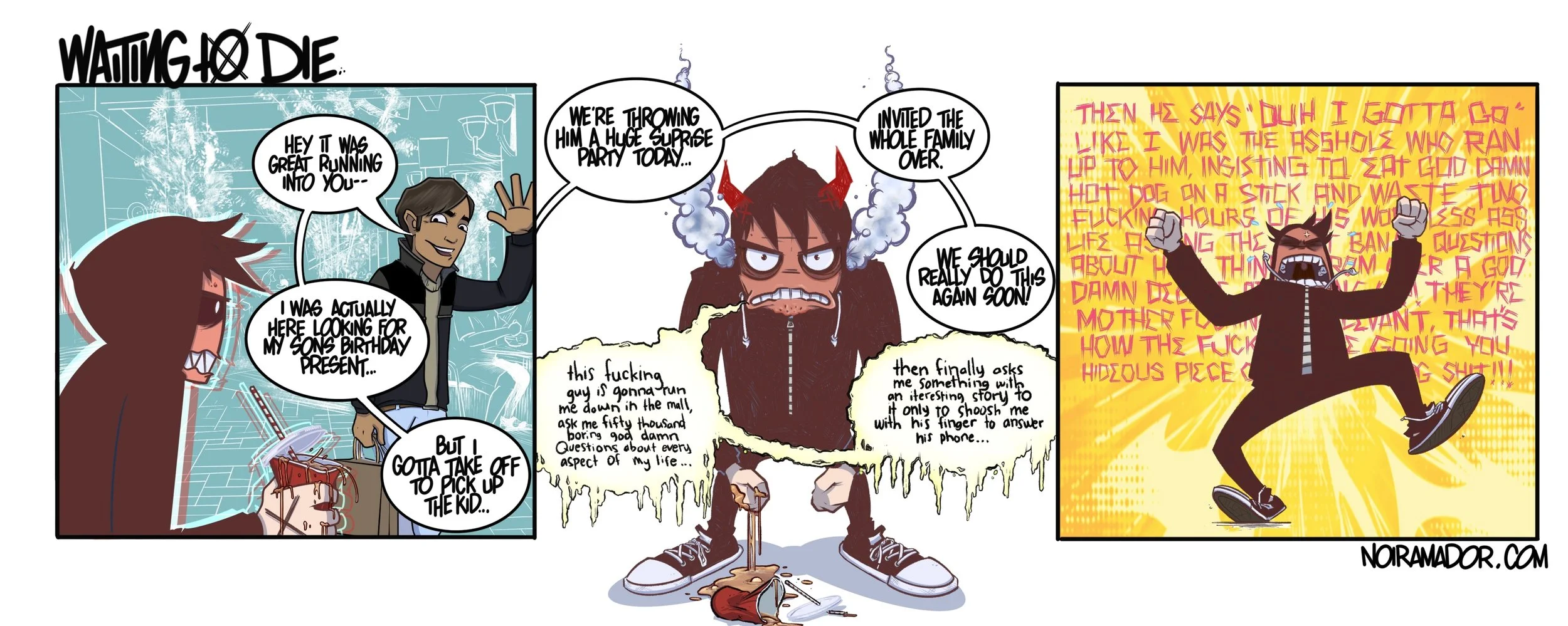 The penultimate strip in the first story arc pays homage to that horrible feeling we’ve all had where someone does or says something that bothers you and all day you’re stewing. You’re mad because you could have said something clever, smart or funny to crush your foe in one fucking sentence if you were 10% smarter. Then 6 hours later in the shower with a head full of spite and a body covered in mid-tier bar soap it happens, you think of the perfect fucking thing you should have said. Now you just wonder how long you’d have to stay in the shower to drown yourself.