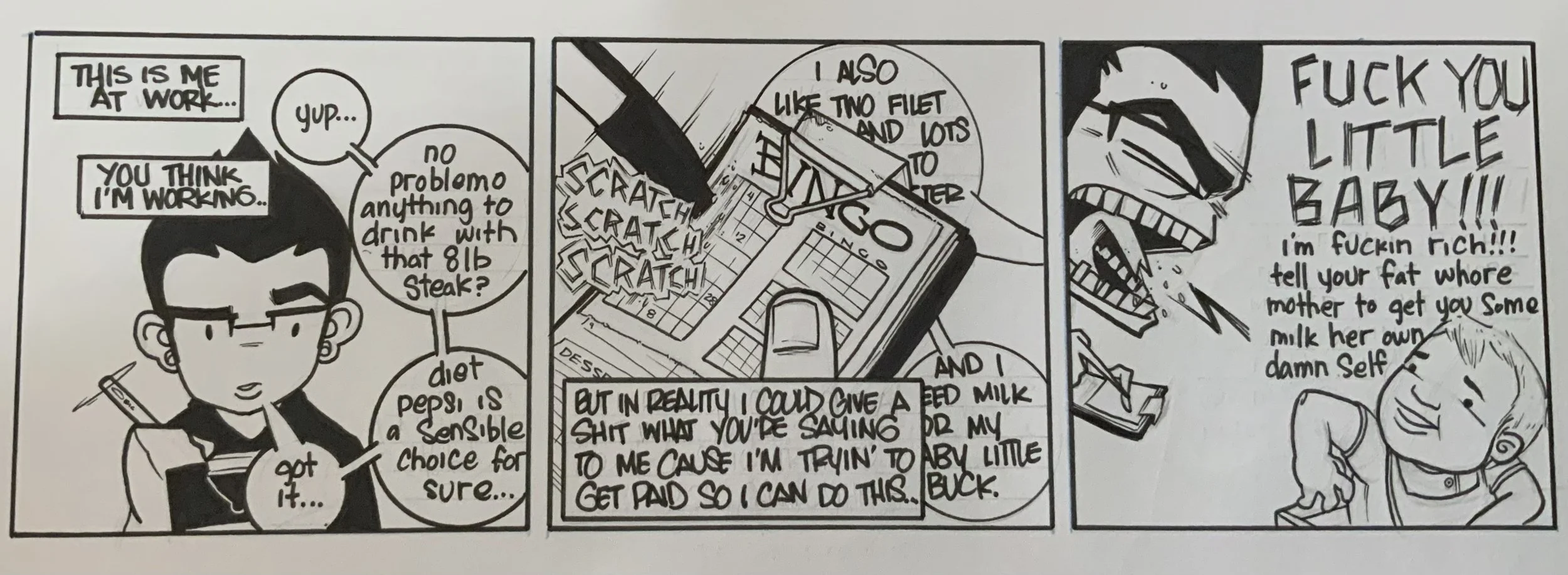 I’m slowly working on redoing some of my older comic strips because there’s people/places/things that are no longer relevant to my life and I want to print a book of comic strips. So this is one of the redone strips from when I used to be a server at a restaurant, and it’s not the first time I punted a baby.